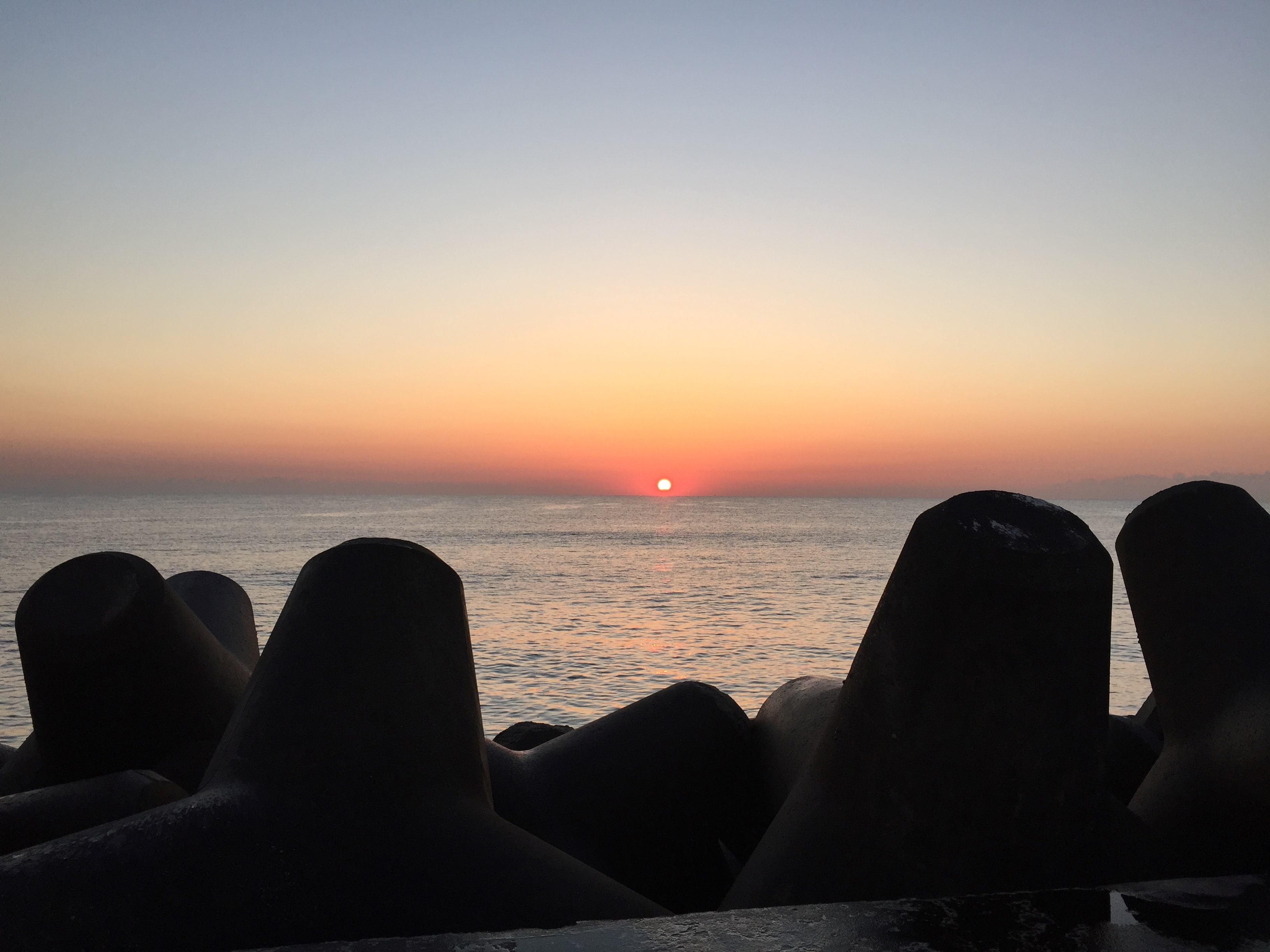 一宮の海岸は離岸流で海岸の砂が流されてしまうのを防ぐように突堤と消波ブロックが置かれている場所が多く、そこから覗き込むように日の出の様子を撮影した。この当時はiPadで日の出の様子を動画撮影し、iPhoneではその様子を静止画撮影してた。その動画はYoutubeにも投稿してたけど、流石に3か月程度で値を上げてしまったなぁ(汗。